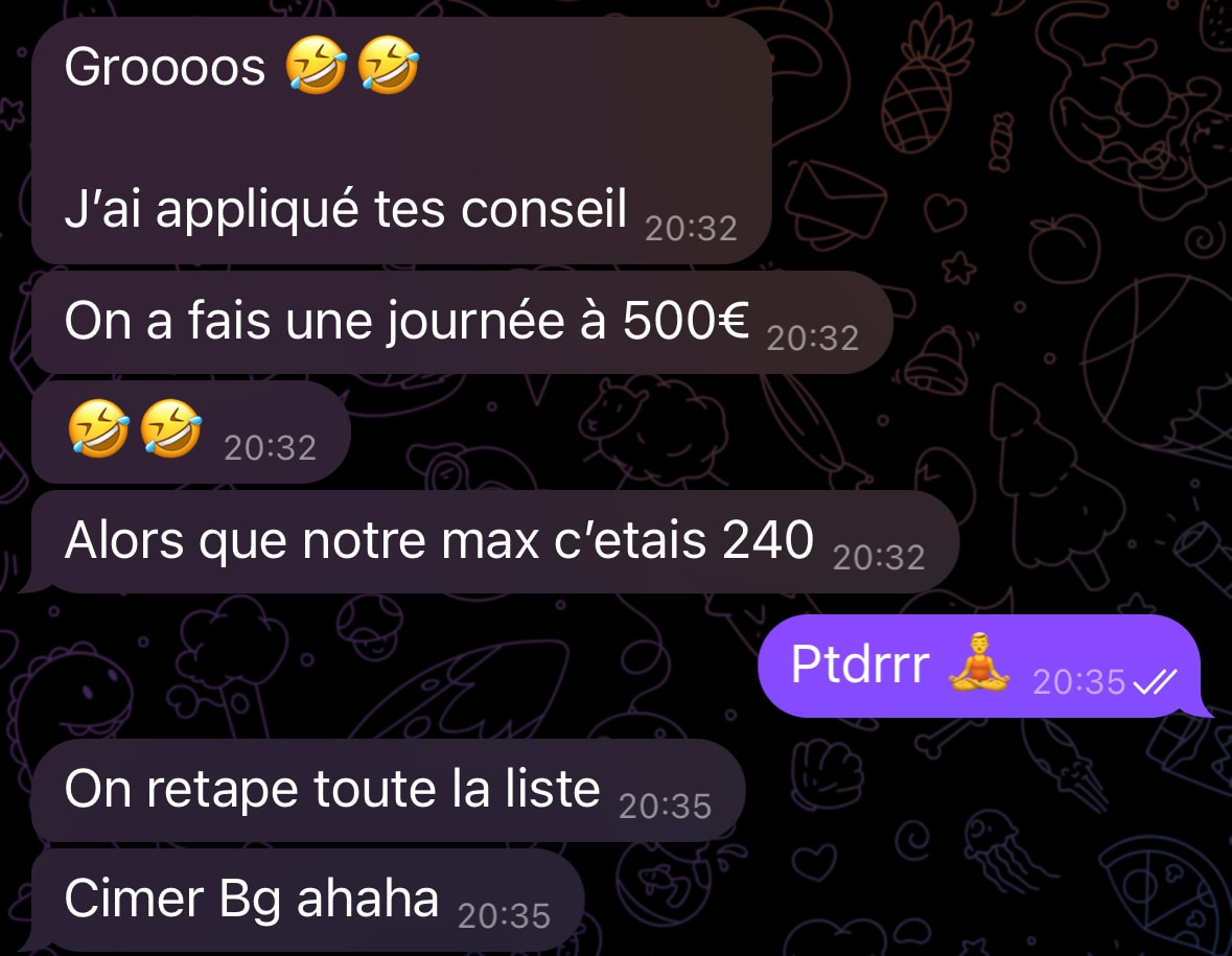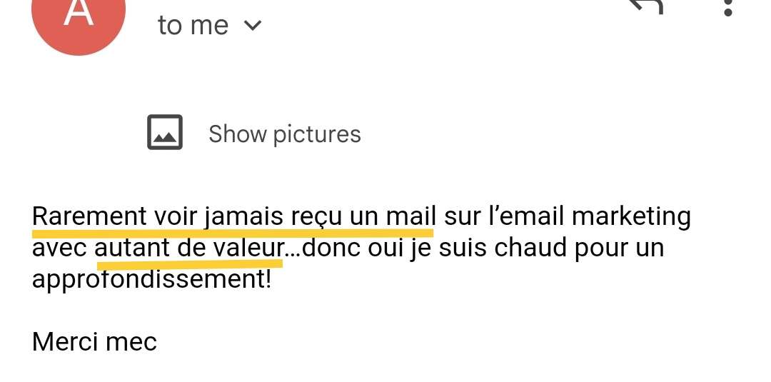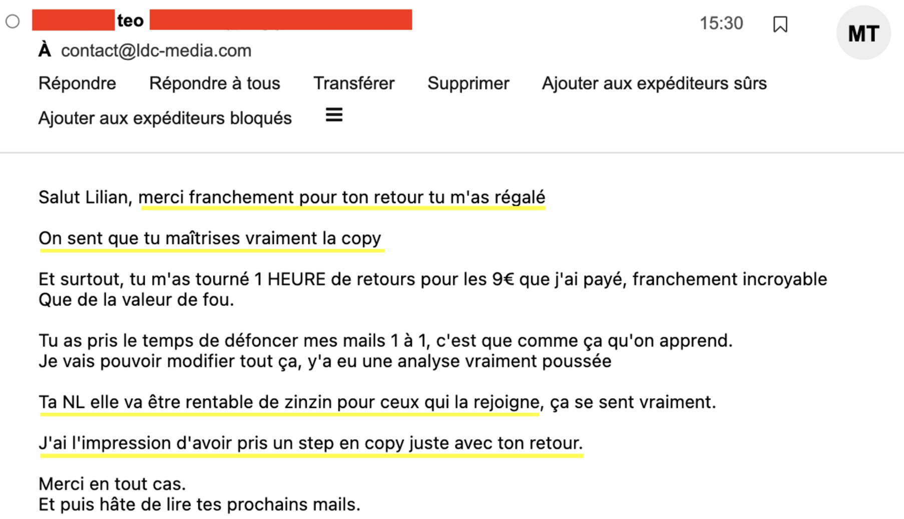 Carrément maintenant ton niveau en copy augmente JUSTE avec le bonus auquel tu as eu accès... Et tu attends donc mes emails TOUS LES JOURS en disant que ça va "être rentable de zinzin" ???!