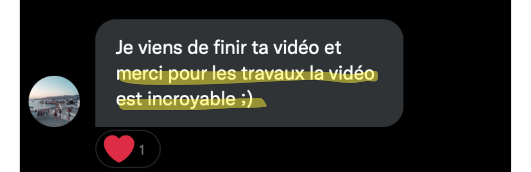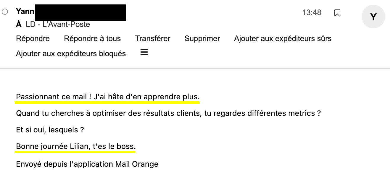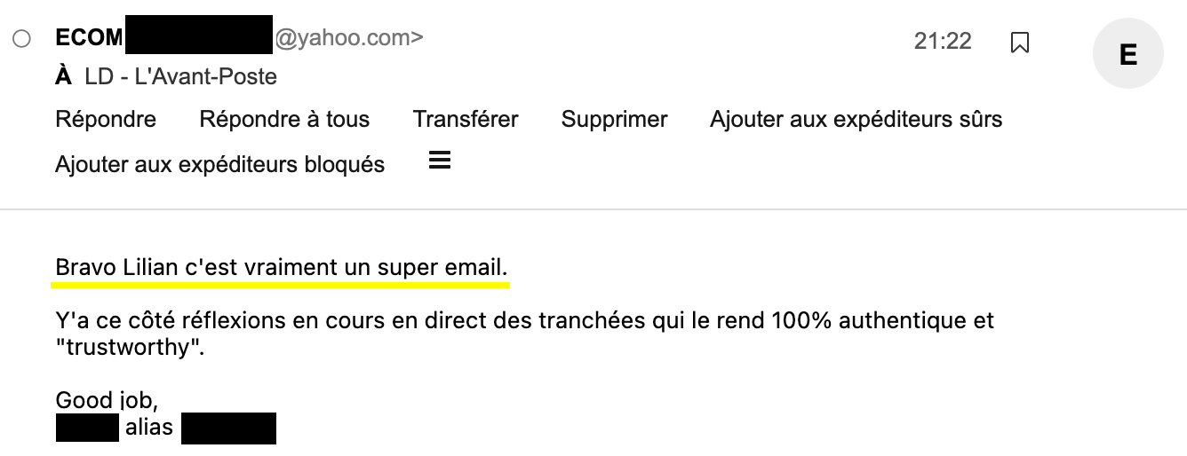 "Bonjour Lilian, j'ai relu tous tes mails. Tes idées sont excellentes. On ne s'ennuie jamais. Très belle variété d'angles. Il y a de belles trouvailles."