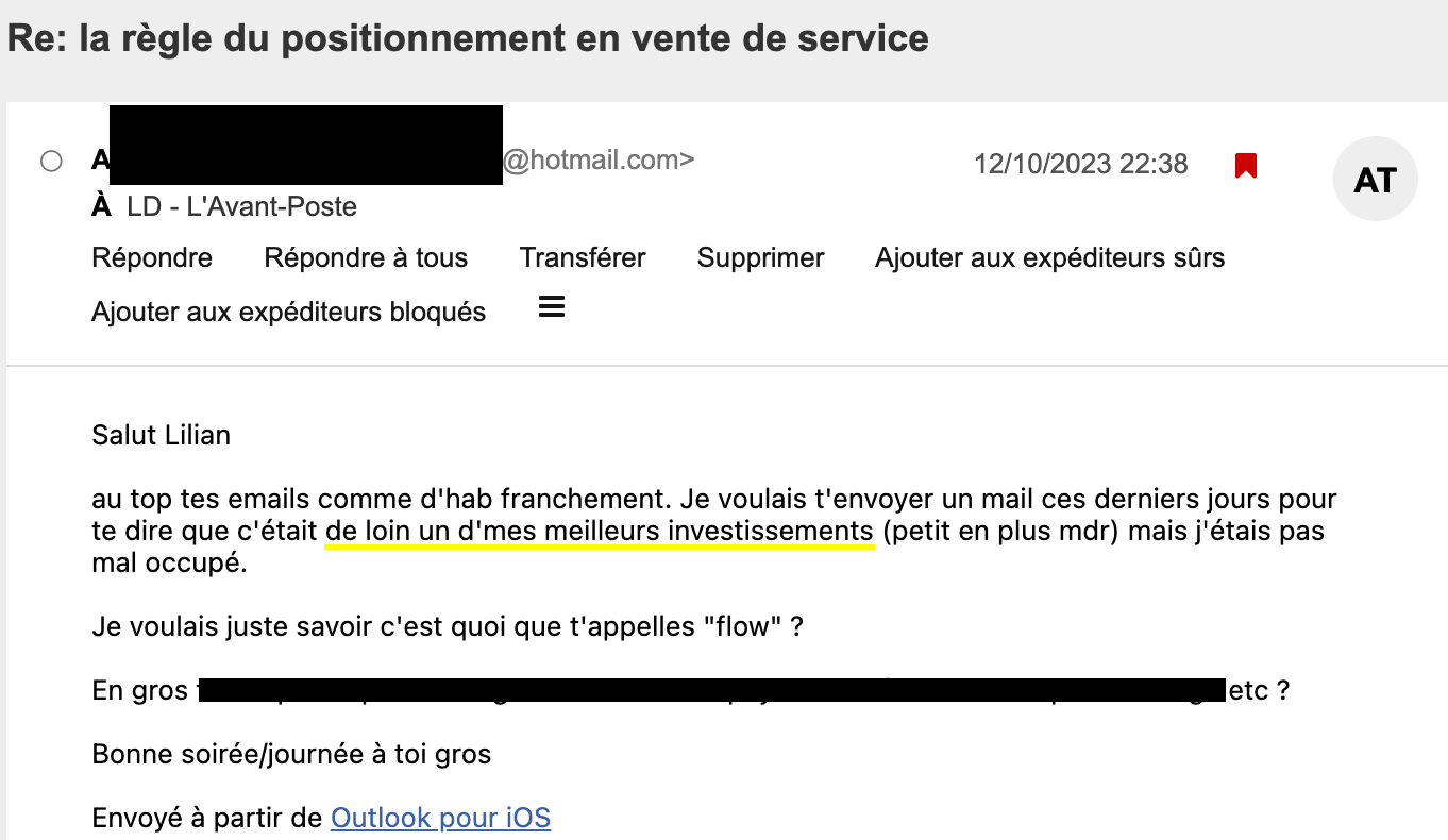 "C’est difficile de trouver de vrais professionnels. Lilian fait partie de ceux en qui j’ai 100 % confiance quand je délègue des clients. PS : Il intervient même en tant que coach pour toute la partie Emailing"