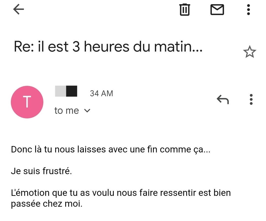 Donc là les gens sont carrément frustrés de ne pas avoir la fin d'un email qui... N'A PARLÉ QUE DE MA VIE... Aucune valeur, rien... Je ne comprends plus rien...