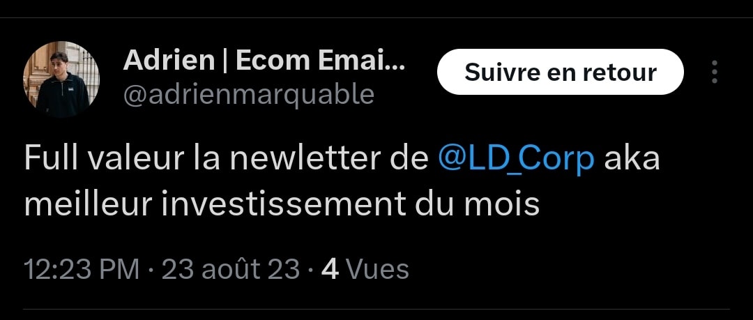 "J'avais commencé l'Ecom au même moment avec LD il y a quelques années et son step up est lourd, ça fait vraiment plaisir. Sa newsletter est de bonne value."